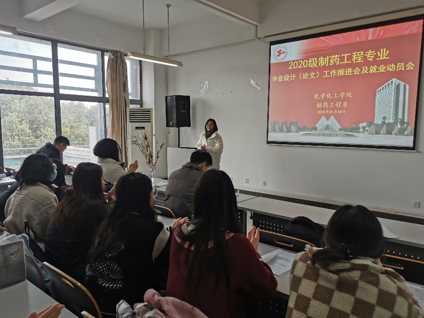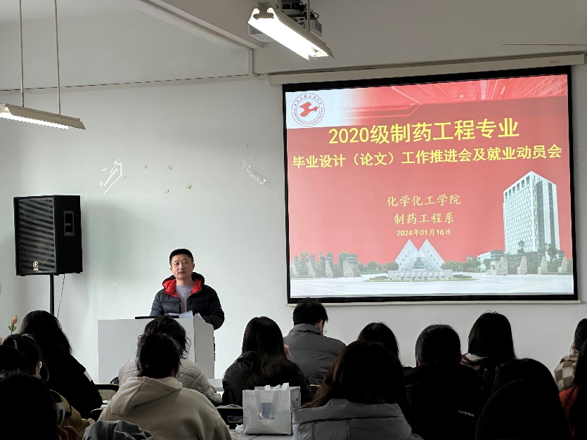 就业工作是最重要的民生工程,就业工作不停歇。临近学期末,化学化工学院制药工程专业为促进应届毕业生学业和就业,1月16日在实训楼4418召开全体毕业生毕业设计(论文)工作推进会暨就业动员会,引导学生积极应对经济形势对就业的影响,实现学生高质量毕业论文及充分就业,制药工程系主任王晗、部分教师代表、辅导员和全体毕业生参会。