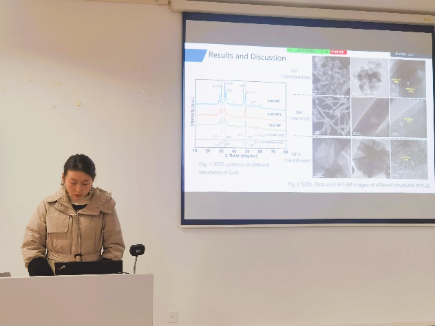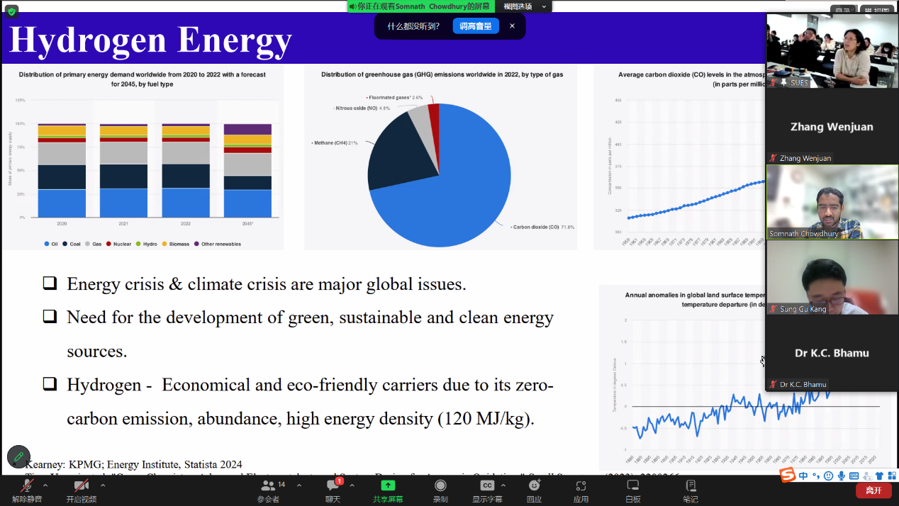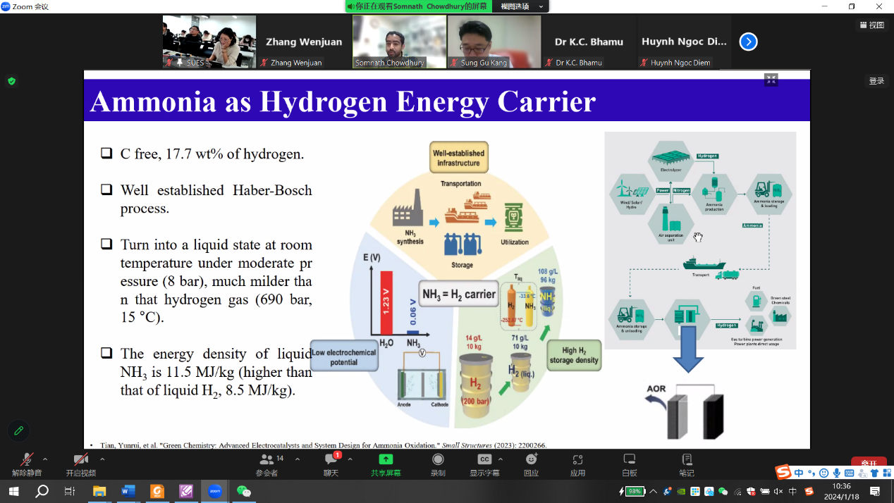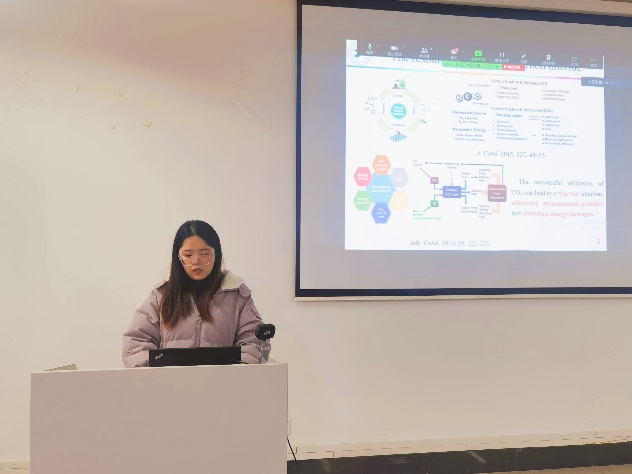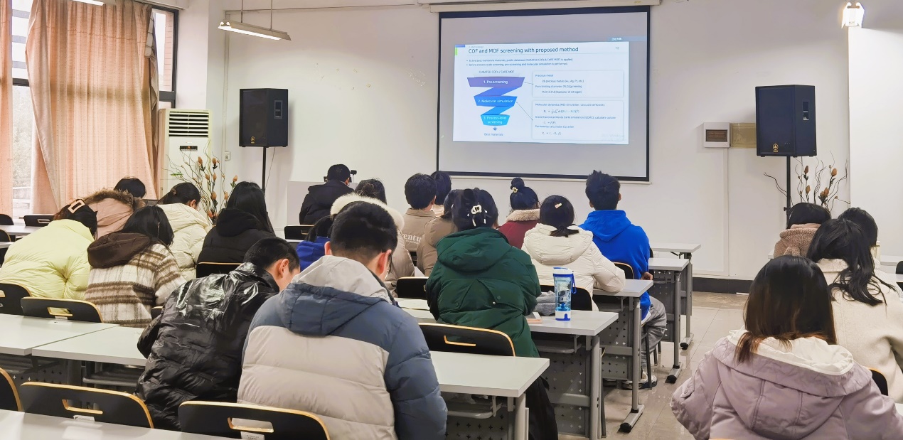 首先是韩国蔚山大学的Seongbin Ga教授作了题为“Machine Learning-based Guidelines for Material Selection in Membrane Process”的专题报告,博士后Tran Van Tam、K. S. S. V. Prasad Reddy和Hamidreza Soltani Panah分别就各自的研究领域进行了分享,并分别进行了题为“Scalable fabrication of NP-doped graphene quantum dots/ graphene aerogel composites as trifunctional electrocatalysts for free-binder and free-metal Zn−air batteries and overall water splitting”、“First-Principles Elucidation of Ammonia Oxidation Reaction Mechanism on Ptn/CeO2 catalysts”和“Binodal and Spinodal Curves of Ternary Systems Containing Lignin Using the NRTL and UNIQUAC Models”的学术分享。中韩双方参会的研究生们也积极汇报了在各自的研究领域取得的研究成果。期间,与会教师、学生就报告内容进行相应的提问,深入探讨双方目前研究方向的共同性与差异性,踊跃交流各自项目的研究原理、研究方法及研究过程中问题的解决等。