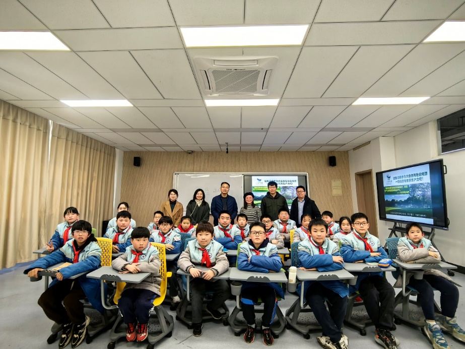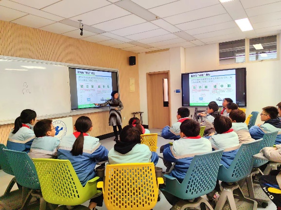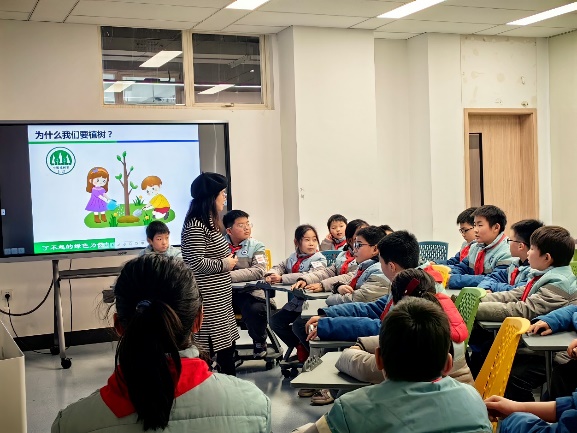 3月11日下午,上海工程技术大学附属松江泗泾实验学校的少先队员代表走进工程大校园开展“‘植’此青绿,共绘春色——大中小劳动教育一体化植树节活动”。在校园空地上亲手种下小树苗后,少先队员们走进教学楼,化学化工学院环境工程系党员教师胡婷莛为小同学们带来了一场生动有趣的绿色低碳科学素养专题讲座——了不起的绿色力量。