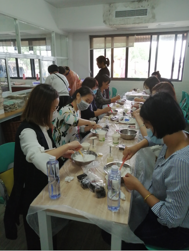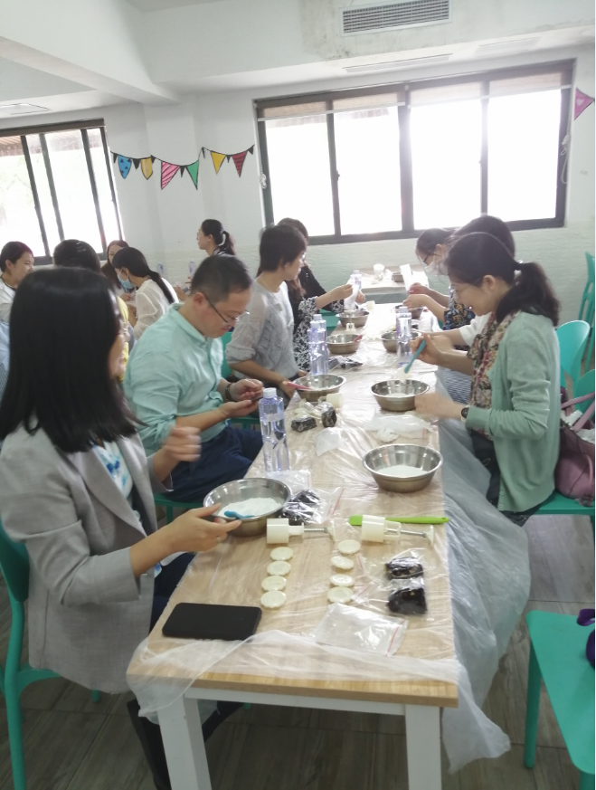随着阵阵秋风的到来,中秋佳节和国庆节相约而至,“仙人醉酒问青天,小小酥饼如明月。中秋东方共婵娟,阡陌坡上约不约”。今天,化工的姐妹们相约吾舍农场做冰皮月饼。一路欢声笑语,久违的相聚,终于可以和大自然亲密的接触。很快到达目的地,合面,搓皮,分馅料,不愧是做实验的好手,很快就有老师把白嘟嘟的月饼做了出来,大家互换模具,使用不同的花纹,忙的不亦乐乎。有动作快的老师很快做满了一盒,包装起来像是著名点心店买来的一样。
