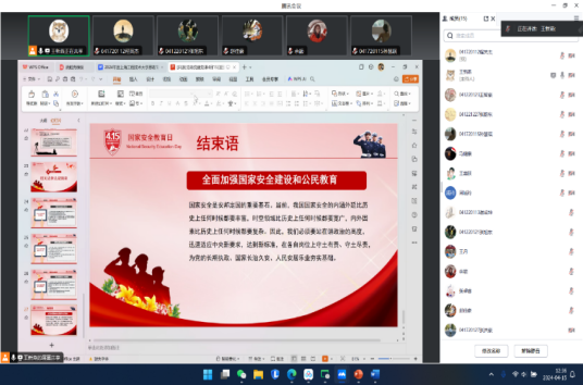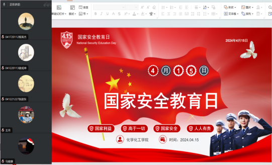 学院研究生、本科生以专业班级为单位,分别由辅导员、班主任、班导师主持召开了国家安全教育主题班会。辅导员王一凡老师在班会上特别讲解了关于网络安全和信息安全的相关事宜,引导学生提高网络安全意识;涂料工程专业王新燕老师在班会上引用典型涉及国家安全的案例,给同学们留下了深刻影响;环境工程系主题班会上强调了反间谍法的学习和从小事做起维护国家安全;制药工程专业在讨论时认为还应该传承和弘扬中华优秀传统文化,抵御不良文化侵蚀,维护国家文化安全。