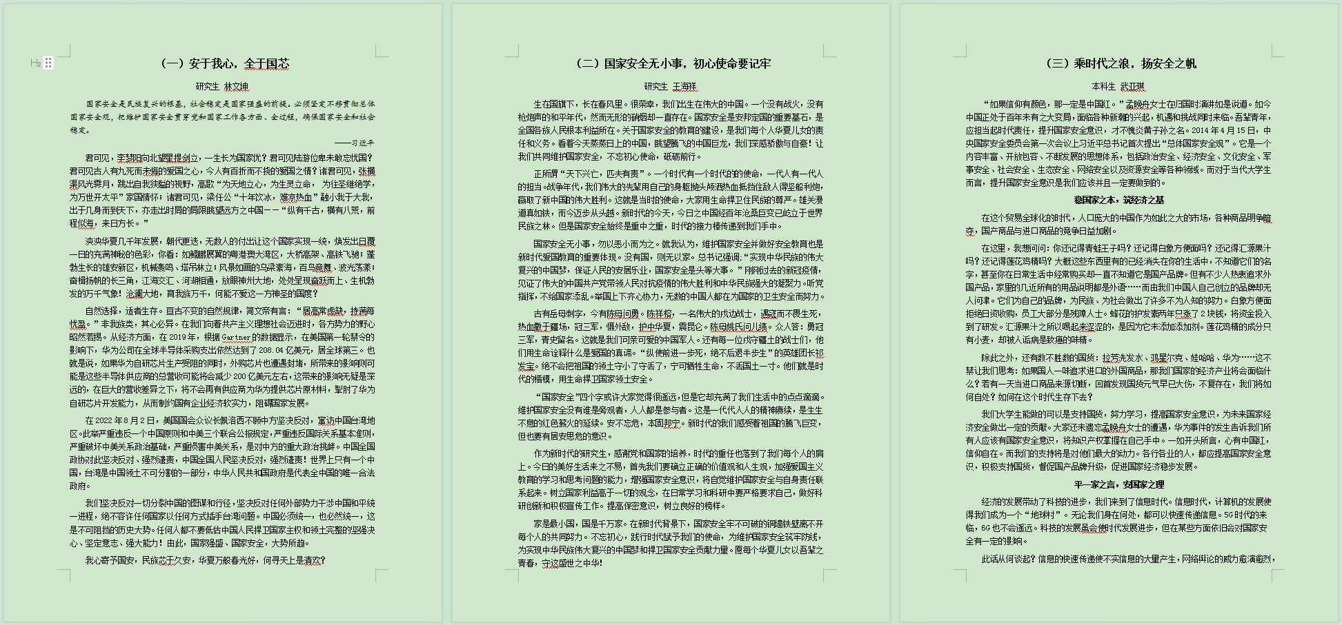 学院组织开展“我眼中的国家安全教育”主题征文活动,号召全院学生通过文字表达,分享自己在日常生活中对国家安全的认识、所见所闻、所学所思,以及对如何提高国家安全意识和能力的思考和建议。活动开展后,收到了包括研究生、本科生在内的学生征文四十余篇,在全院营造了人人重视国家安全教育的良好氛围。