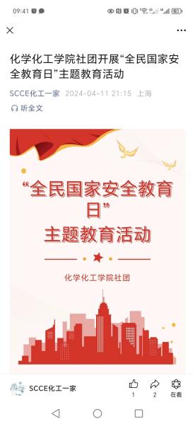 学院充分利用网络资源宣传国家安全相关知识。一方面,团委组织各团支部、社团通过观看国家安全科普视频、参与网络国家安全主题互动等方式宣传国家安全;另一方面,团委在学院微信公众号“SCCE化工一家”、易班中心在易班平台推送多篇国家安全教育主题推文,有效扩大了宣传范围。