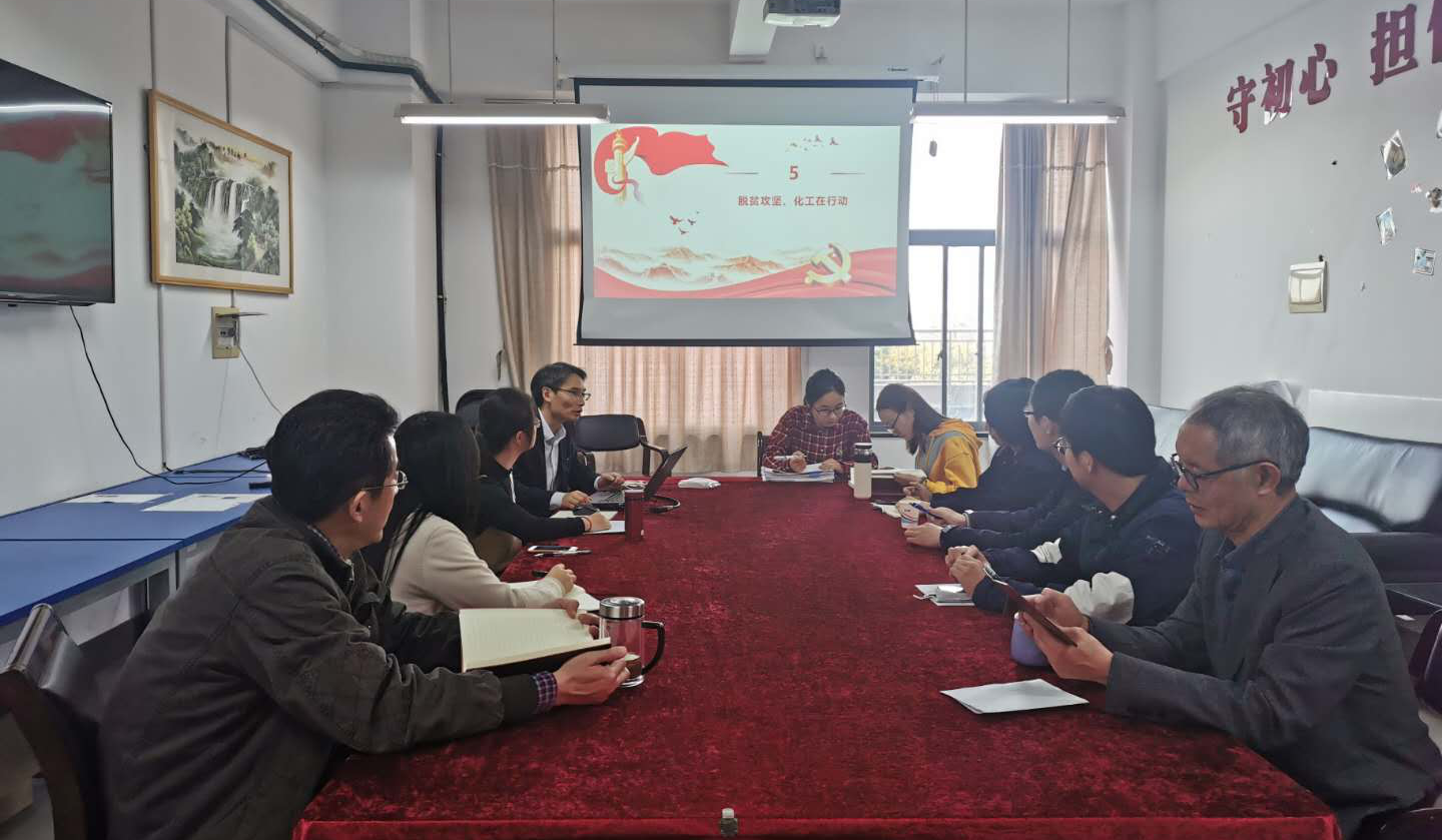 为深入学习贯彻习近平新时代中国特色社会主义思想,以“四史”学习教育涵养初心使命,围绕“脱贫攻坚”主题,化学化工学院于11月6日下午在实训楼4404会议室开展了“化工强国:化工人的初心、使命和担当——脱贫攻坚、化工人在行动”专题党课。党课由化学化工学院党委副书记、院长饶品华同志主讲,党支部全体党员参加了学习。