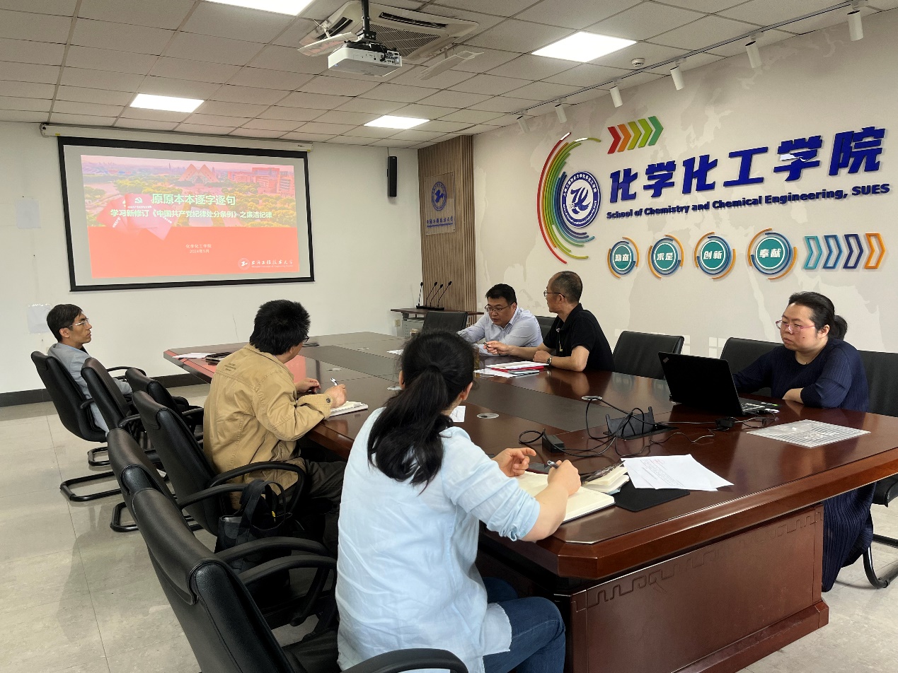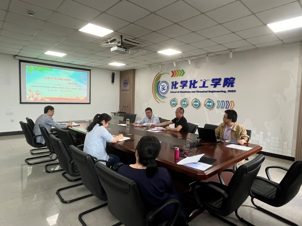 5月23日,化学化工学院党委开展党纪学习教育读书班,学习研讨《中国共产党纪律处分条例》(以下简称《条例》)的廉洁纪律和群众纪律内容,学院领导班子成员参加会议,学院党委书记宋勤健主持。