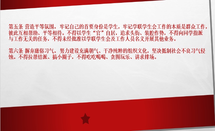 本次对《关于学联学生会工作人员改进作风服务同学的若干规定》的学习,旨在全面增强院团委学生会工作人员的工作作风,恪守学生本分,牢记服务宗旨,充满朝气,干净纯粹的化院学生工作队伍,为化学化工学院的灿烂明天而奋斗。