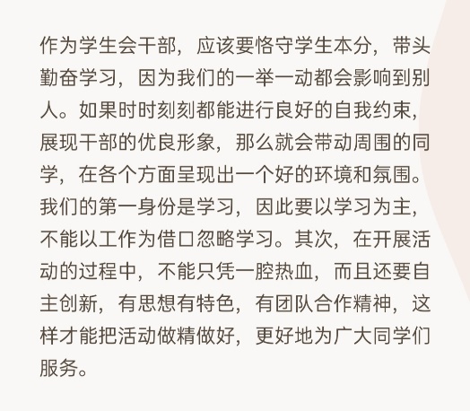 即便在学生会工作,我们依然还是学生,学习依旧是我们的本职工作,不能以学生会的工作为理由而耽误自己的学习。其次,学生工作以为学生服务为宗旨,全心全意为学院或学校的学生服务。不能只做表面功夫,要脚踏实地,求真务实地完成学生工作。