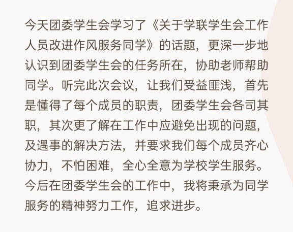 此次会议通过对《关于学联学生会工作人员改进作风服务同学的若干规定》六条的学习,指出各部门要勤于反省和自我批评,把努力为同学服务放在学生工作的首要地位,扎根同学、求真务实,坚决抵制社会不良风气的侵蚀。