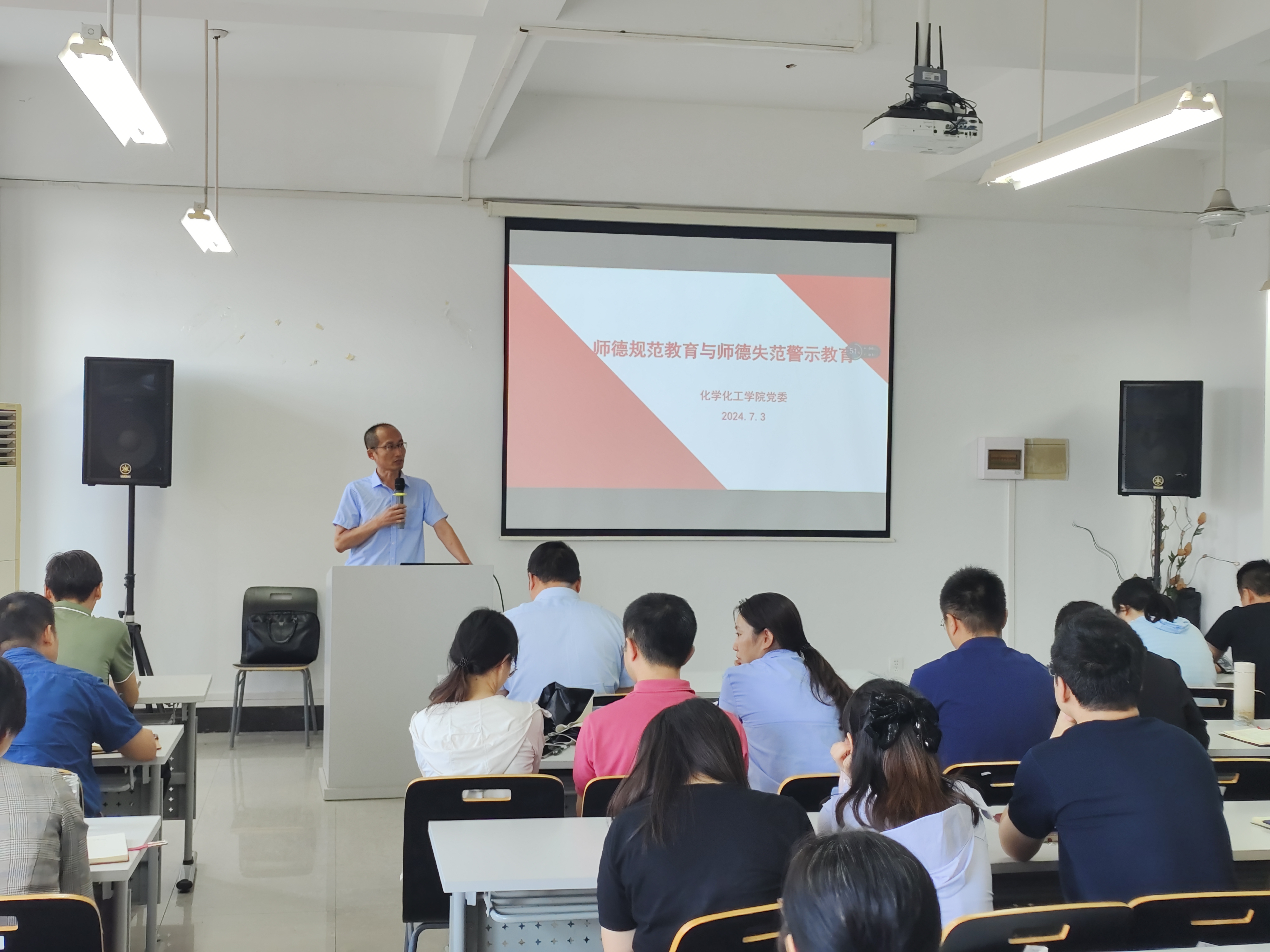 为加强学院教师思想政治和师德师风建设,落实立德树人根本任务,弘扬新时代高校教师道德风尚,努力建设有理想信念、有道德情操、有扎实学识、有仁爱之心的教师队伍。7月3日,化学化工学院党委书记宋勤健组织全院教职工开展了师德规范教育与师德失范警示教育。