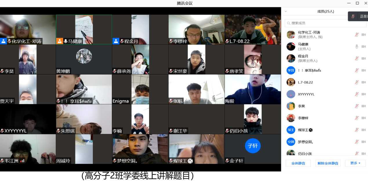为了培养同学们良好的学习习惯,提升同学们的自主学习能力,化学化工学院20级高分子2班自1月22日起在辅导员郑文静老师的带领下开展“居家抗疫 集体学习”线上活动。