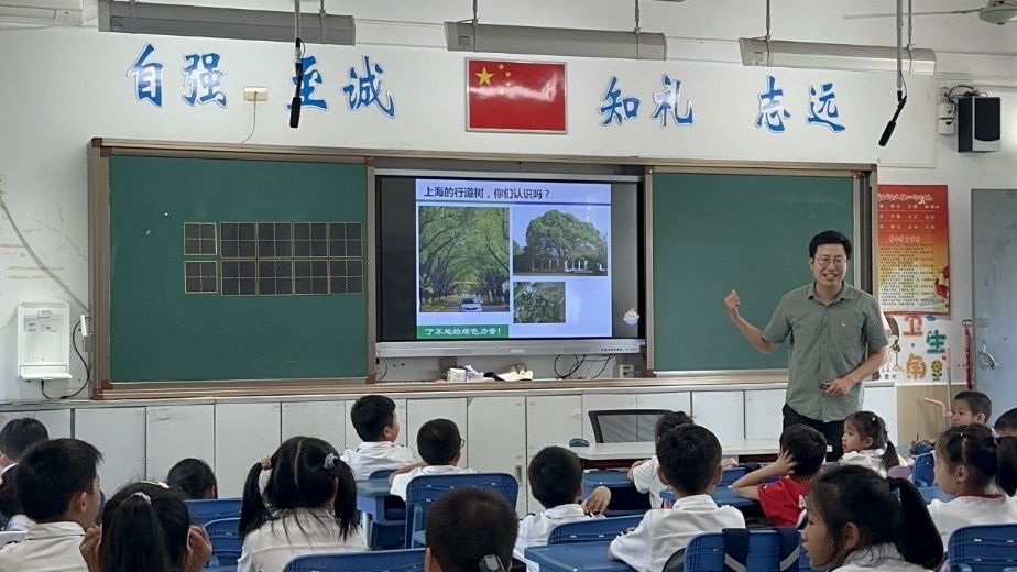 团队教师首先为上外松外的小朋友们带来了一场题为“了不起的绿色力量”的科普讲座,通过丰富的图文生动讲解了植物在生态系统中的关键作用,特别是树木在涵养水源、净化空气、调节气候、维持生物多样性方面的重要贡献。在实践体验环节,团队教师带领小朋友们开展生态瓶制作,通过动手实践,小朋友们初步了解了如何构建和维护健康的生态系统,加深了对生态循环和环境保护的认识。