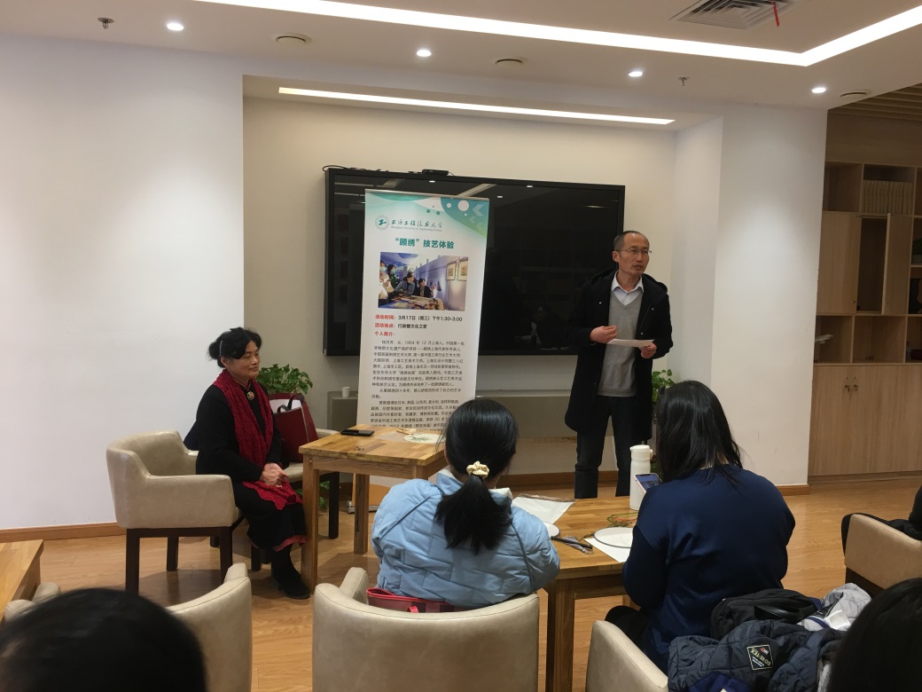 活动开始前,柳如荣主席向全校女教师致以节日的祝贺,并介绍了钱月芳大师的艺术成就,他说:“钱老师是第一届中国工美行业艺术大师、大国宗师、三八红旗手、上海市工匠,获得过上海市五一劳动奖章荣誉称号,担任东华大学‘锦绣丝路’实践育人顾问。她为‘顾绣’被认定为工艺美术品种,为培养顾绣传承人和接班人做出了重要贡献。”他对钱老师莅临本次活动,并亲自指导我校女教师学习和掌握“顾绣”技艺表示衷心感谢。