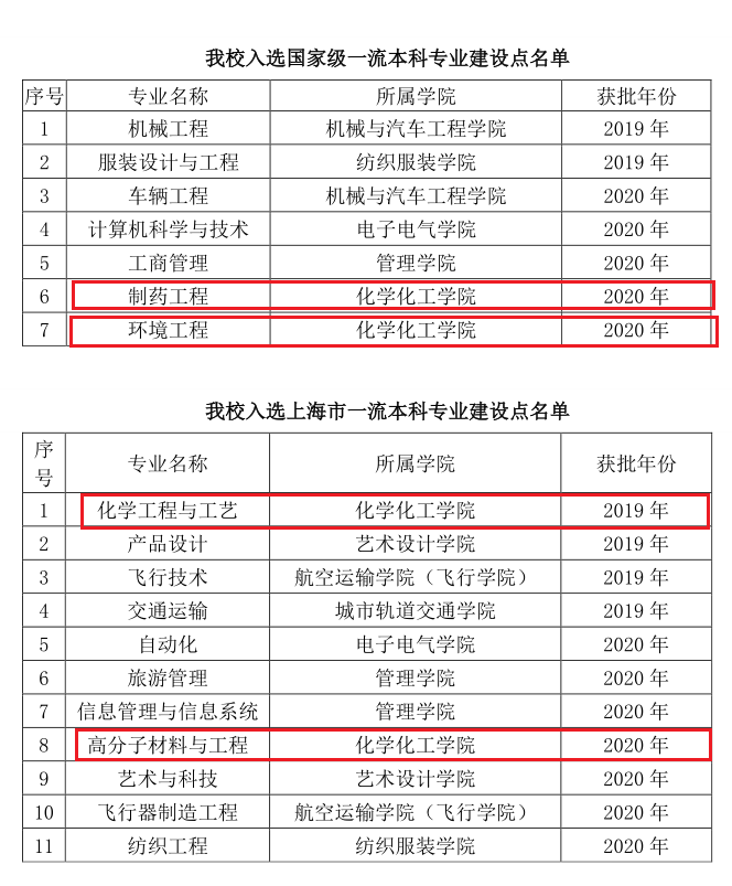近日教育部印发《教育部办公厅关于公布2020年度国家级和省级一流本科专业建设点名单的通知》(教高厅函﹝2021﹞7号),我校车辆工程、计算机科学与技术、工商管理、制药工程、环境工程5个专业入选国家级一流本科专业建设点,自动化、旅游管理、信息管理与信息系统、高分子材料与工程、艺术与科技、飞行器制造工程、纺织工程7个专业入选上海市一流本科专业建设点。