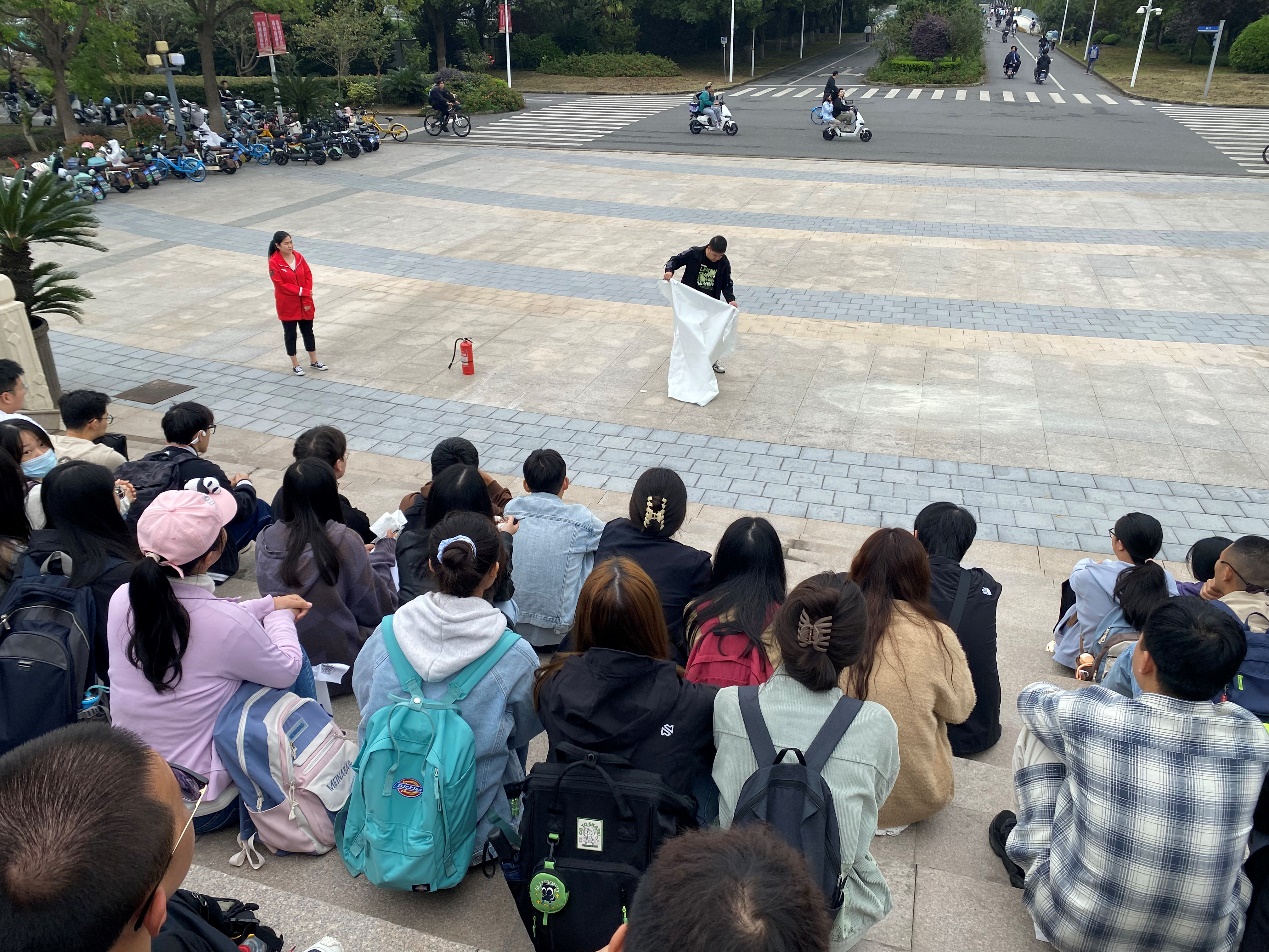 10月21日中午,学院组织全体研一同学在体育馆周边开展消防基础演练,针对灭火器和灭火毯的实际操作进行培训。