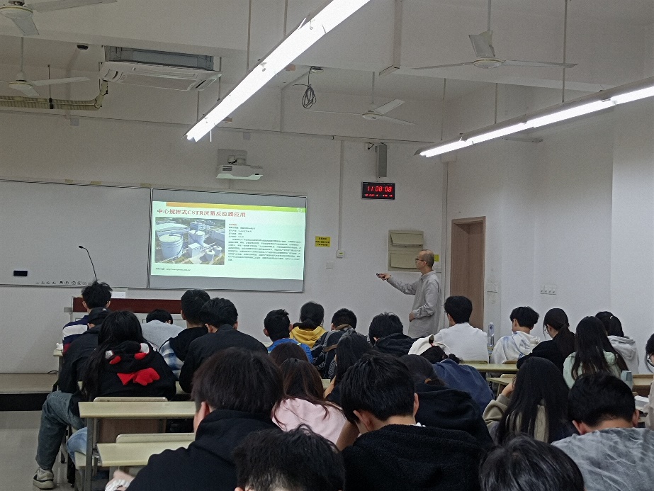 吴健老师以“敢于想象、勇于创新”为切入点,引出他从业以来在工作岗位上学习和创新的历程,并介绍了零碳绿谷园区相关项目的最新情况。吴老师系统讲解了园区餐厨垃圾浆料的厌氧消化、餐厨垃圾渣和秸秆的生物干化以及垃圾渗滤液厌氧处理等内容,从相关技术发展史、主要原理、反应器结构、工艺流程和参数等各方面展开,为同学们详细介绍了园区最新的工程技术,也分享了他在工作中所遇到的问题、解决方法与心得思考。讲座内容与本课程理论知识有机衔接,同时紧扣当下我国“双碳”战略需求,开拓了同学们的视野,增强了学生对环境生产实践和行业发展现状的认识。