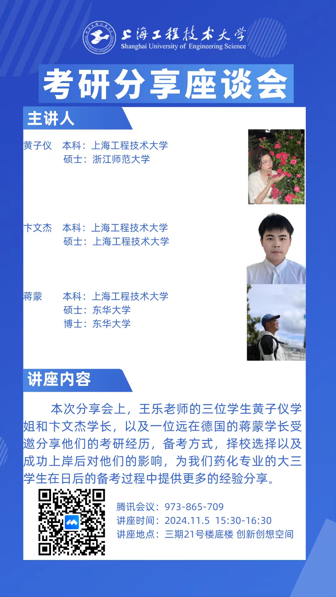 近日,化学化工学院举行了一场旨在帮助药物化学专业大三学生理清考研思路、明确考研方向的座谈会。此次座谈会由2022级药物化学专业班主任王乐老师主持,班长顾文毅协助,邀请了三位优秀的学长学姐,他们分别是黄子仪(线上)、蒋蒙(线上)以及卞文杰。三位学长学姐围绕择校、备考思路、复习安排以及个人建议四个方面,为在场的学弟学妹们提供了宝贵的经验。