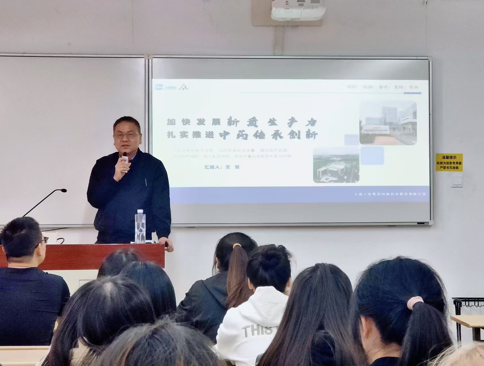 为加强我校制药工程专业产教融合建设,增强学生对中药数智化制造体系及中药产业新质生产力的认识,近日,制药工程系邀请了上海上药杏灵科技药业股份有限公司总经理、高级工程师王军走进我校“天然药物化学”课堂,为同学们带来了一场题为“加快发展新质生产力、扎实推进中药传承创新”的精彩报告。