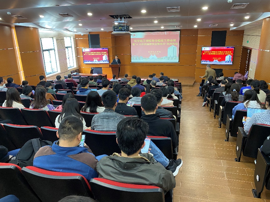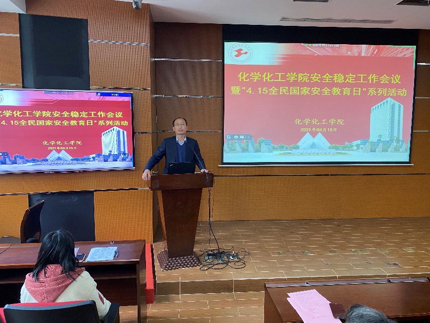 2021的4月15日是第6个全民国家安全教育日,化学化工学院在航飞楼报告厅召开化学化工学院安全稳定工作会议,会议由饶品华院长主持,学院全体教师及全体2019级研究生参加现场会议,其余研究生通过腾讯会议参加线上会议。