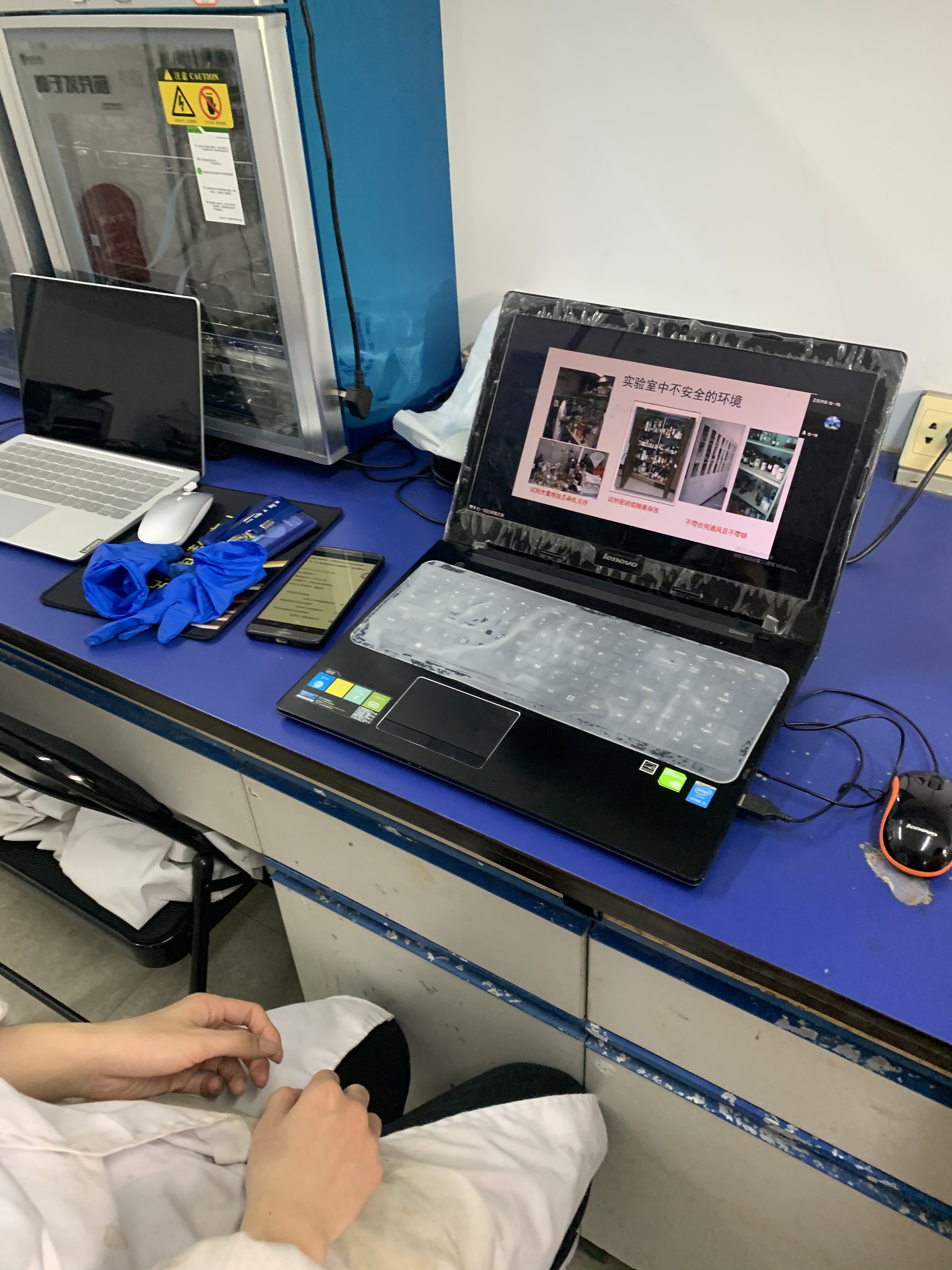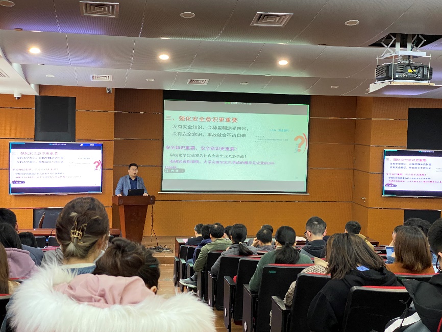 随后,化学化工学院副院长王金果开展实验室安全教育,从身边的案例切入,指出实验室中可能存在的危险,强调强化安全意识的重要性,并对学校、学院相关政策及研究生安全教育体系进行了介绍,使师生们意识到“安全来自警惕,事故源于大意”。
