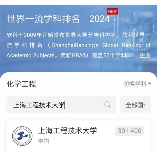 高等教育权威评价机构软科近日正式揭晓了2024年度“软科世界一流学科排名”,我校化学工程学科再度登榜,延续了自2022年以来连续入围的成绩,并且在排名上实现了显著飞跃:从2022年的401-500位跃升至301-400位,彰显了我校在化学工程领域的不断进步。