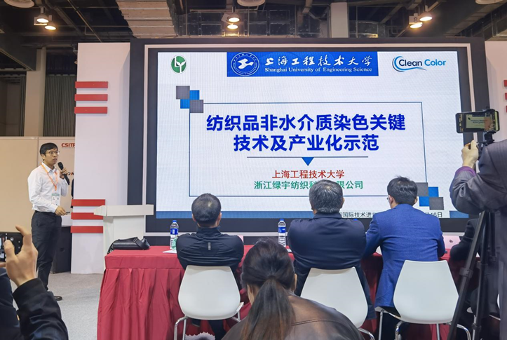 在上海教委科发中心和各高校举办的“创智汇”路演活动中,我校纺织化学清洁生产工程技术研究中心副主任裴刘军展示了与海宁绿宇纺织科技有限公司合作开发的适用于棉花的非水介质染色系统和相应的介质回收系统,其团队将具有介质功能即物质输送和能量传导功能的水,用一种既不能溶解染料也不能和水相溶的非极性溶剂来替代,实现了活性染料在无盐条件下98%以上的上染率,固色率从65%提高到90%以上,实现了节水95%以上,达到污水零排放目标。