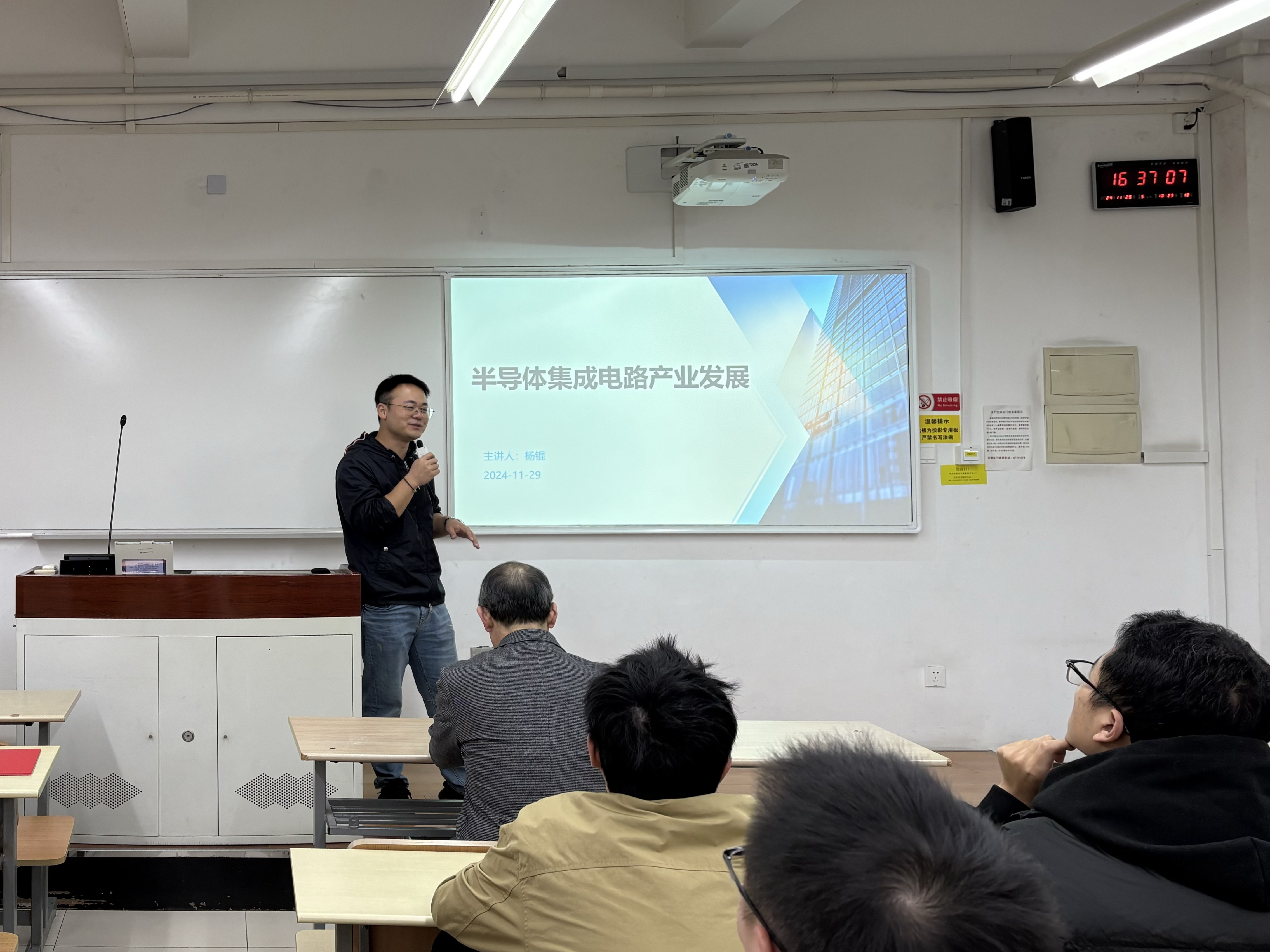 在教学过程中,杨锟经理主要讲述了国内外最新的光刻离子注入与刻蚀技术,阐述了集成电路一站式芯片在汽车、新能源、工控、家电等领域的发展与应用。与此同时,还对同学们未来的职业规划作出了精准的定位,分享了目前行业内急需的人才类型,为学生未来就业发展方向提出了宝贵的建议。在课程的最后,杨锟经理与学生积极互动,还鼓励我校研究生应该勇于面对挑战,保持学习的热情,不断充实自己,创造更辉煌的未来。