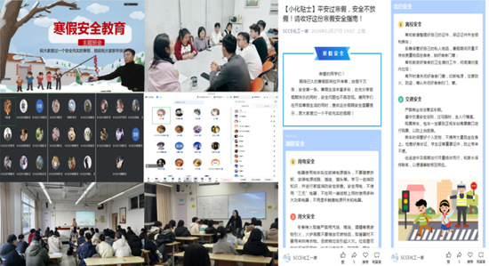 研究生辅导员邓月要求在校研究生务必严格遵守实验室相关操作规定、做好个人安全防护;本科生辅导员王一凡、王小萌叮嘱同学们无论是在返乡途中,还是外出旅游,都应把安全意识放在首位,遵守交通规则,确保出行安全。班主任丁大民、石峰提醒同学们春节期间注意饮食安全,在合理规划假期时间的前提下对过去一学期的学习进行查漏补缺。心理健康专职辅导员张燕黎就心理调适与良好心态养成做了详细讲解,思政辅导员张晓普利用近期网络诈骗案例教育同学们要提高防诈骗意识,并强调了意识形态安全。学院团委书记王新燕通过团委会议向同学们传达了学院关于假期安全教育的相关要求,还在微信公众号推出了寒假安全专题推文,提醒同学们把安全意识始终牢记在心间。