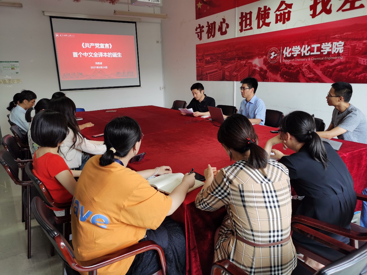 党史学习由党支部书记冯煌迪主持,全体党员和部分教工代表参加。同志们一起回顾了《共产党宣言》首个中文全译本的诞生历史。通过历史资料、文物图片等,重温了这一世界无产阶级运动的标志性著作在中国的问世。这一译本的传播,对早期马克思主义者来说极具理论价值,在提高理论能力的同时,更帮助他们明辨是非、认清敌友,在以马克思主义为指导、走一条全新的无产阶级专政道路上更加坚定自觉。这为马克思主义在中国的广泛传播、为中国共产党的建立、为中国革命运动的发展发挥了重要的助推作用。