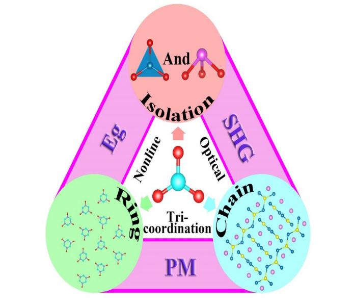 三配位离子基团排布对于含有碱(土)金属三配位阴离子基团化合物的非线性光学效应、相位匹配能力以及带隙大小等性能具有重要影响,相关研究对于探索新型非线性光学晶体材料具有重要意义,此项研究成果发表于《Coordination Chemistry Reviews》,题为“Structure-performance relationship in tri-coordinated nonlinear optical materials toward optimal second harmonic generation and phase matching”(DOI:10.1016/j.ccr.2021.214038,第一作者:候凤娟,共同通讯作者:梅大江、夏明军)。