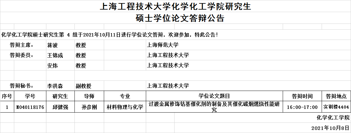 上海工程技术大学化学化工学院研究生硕士学位论文10月11日答辩公告