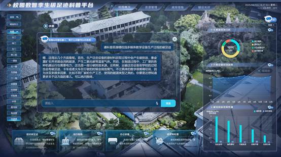 依托化学化工学院在智慧赋能碳管理领域的研究基础和数字孪生领域的技术积累,平台深度融合无人机实景测绘、UE5三维渲染引擎与大语言模型等前沿科技,成功构建校园级“碳中和智能体”。平台实现了对校园建筑能耗、资源消耗及废弃物处理全生命周期的精准动态追踪。师生不仅能通过沉浸式交互界面直观观察能量流、物质流与碳足迹变化过程,还可借助平台开展减碳方案模拟演算,让绿色低碳学习从理论走向实践。平台的建成,不仅为校园碳管理提供了科学的数据支撑与智能决策依据,更成为高校创新绿色教育形式的标杆案例。