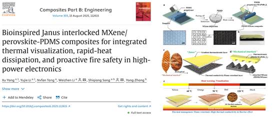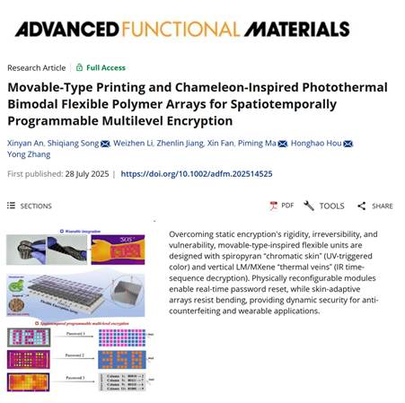 近日,化学化工学院宋仕强副教授指导硕士研究生安新妍、杨旭分别在学术期刊《Advanced Functional Materials》(中科院一区Top,影响因子19)、《Composites Part B: Engineering》(中科院一区Top,影响因子14.2)上发表了题为“Movable-type Printing and Chameleon-Inspired PhotothermalBimodal Flexible Polymer Arrays for Spatiotemporally Programmable MultilevelEncryption”和“Bioinspired Janus Interlocked MXene/Perovskite-PDMSComposites for Integrated Thermal Visualization, Rapid-heat Dissipation, andProactive Fire Safety in High-Power Electronics”的研究论文。