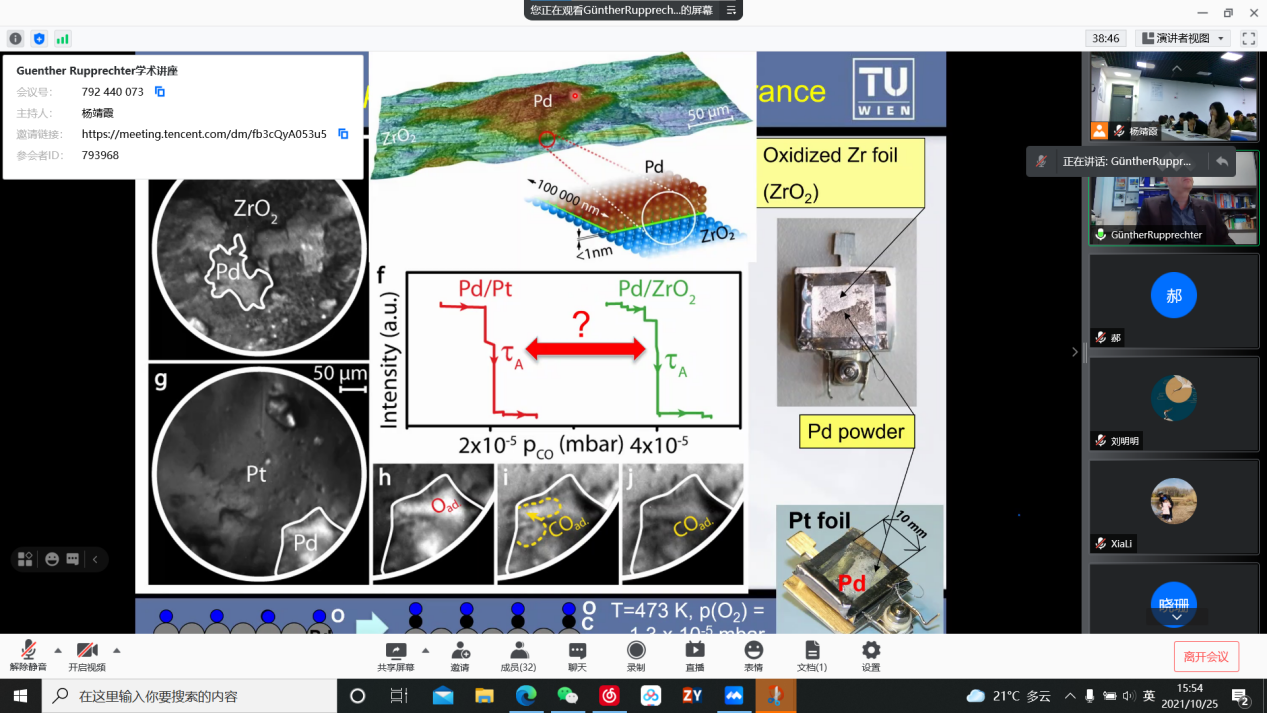 2021年10月25日下午,世界著名多相催化专家,奥地利科学院院士Günther Rupprechter作为海外名师应邀,通过腾讯会议(会议号:792 440 073)为我校研究催化反应领域的全体师生作了《Watching ongoing reactions by single particle catalysis》的专题讲座。