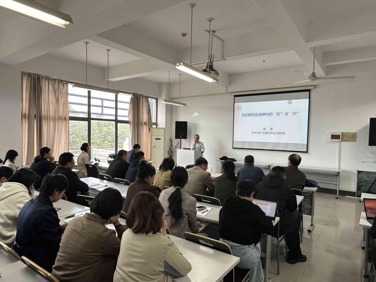 11月11日,化学化工学院于实训楼4418开展研究生导师培训,东华大学博导、水污染控制学科带头人薛刚教授围绕“刍议研究生培养中的‘教’与‘学’”主题和学院82名导师共探育人路径。