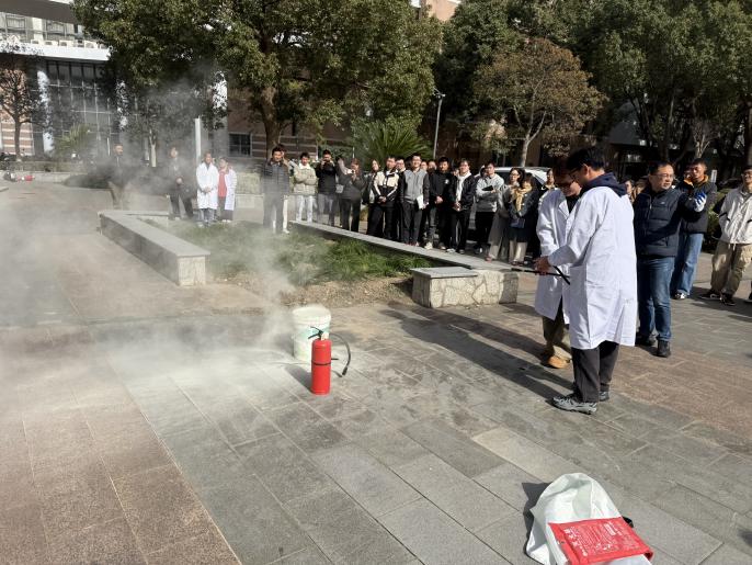 集合完成后,保卫处吴挺老师在现场为参演师生开展了初期火灾的灭火器材培训。介绍并演示了消防沙、灭火毯、灭火器等常见火灾初期的灭火器材的使用方法与要点,并组织部分同学开展了现场操作演练。