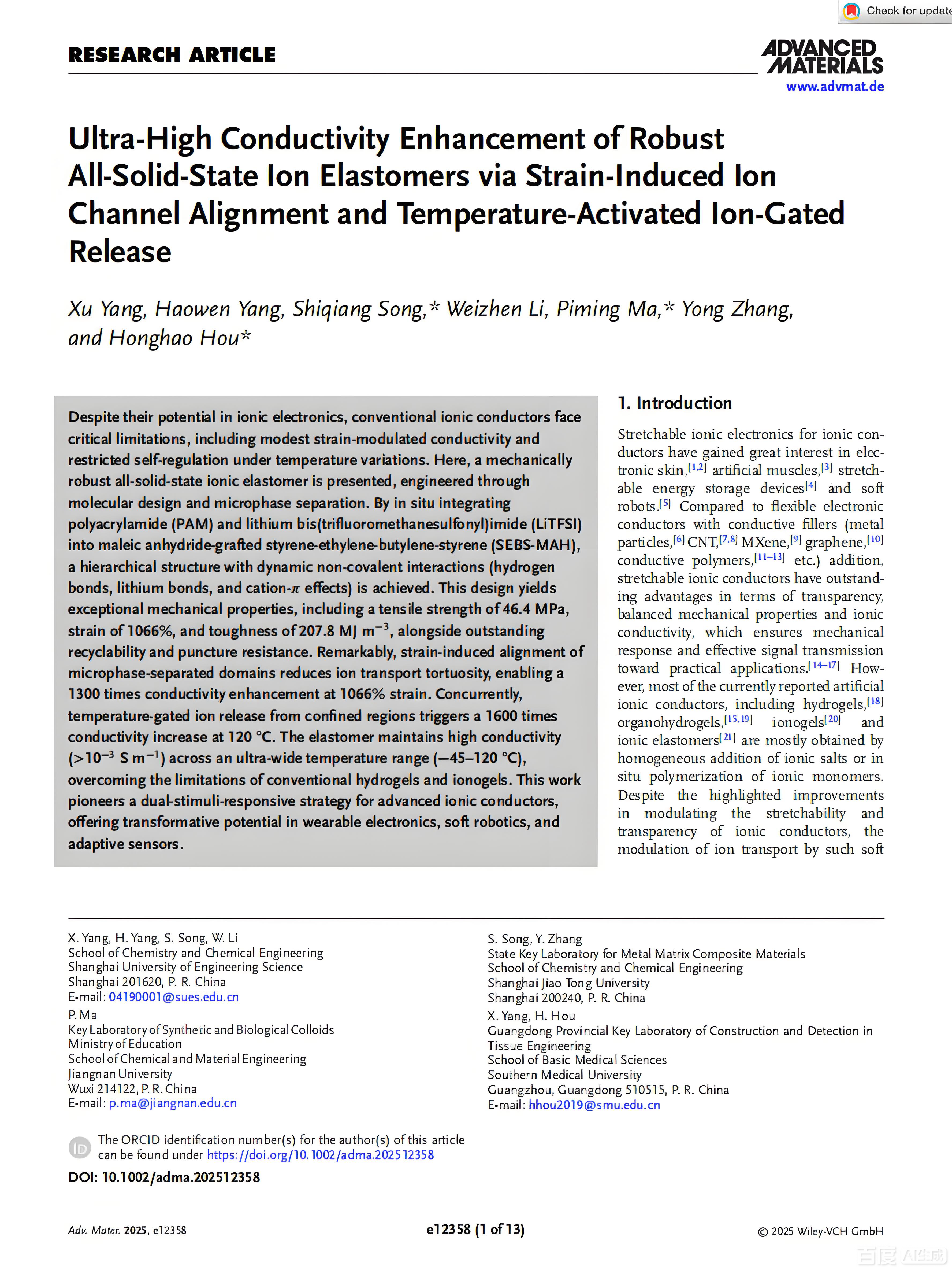 近日,我校化学化工学院宋仕强副教授团队在材料科学领域国际顶尖期刊《Advanced Materials》上发表了最新研究成果,论文题目为“Ultra‐High Conductivity Enhancement of Robust All‐Solid‐State Ion Elastomers via Strain‐Induced Ion Channel Alignment and Temperature‐Activated Ion‐Gated Release”。该期刊是材料科学领域的旗舰期刊,以其极高的学术声誉和广泛影响力著称,最新影响因子高达26.8。此项成果是我校以第一单位在该期刊上发表的论文,标志着我校在先进功能材料前沿基础研究方面取得重大突破。