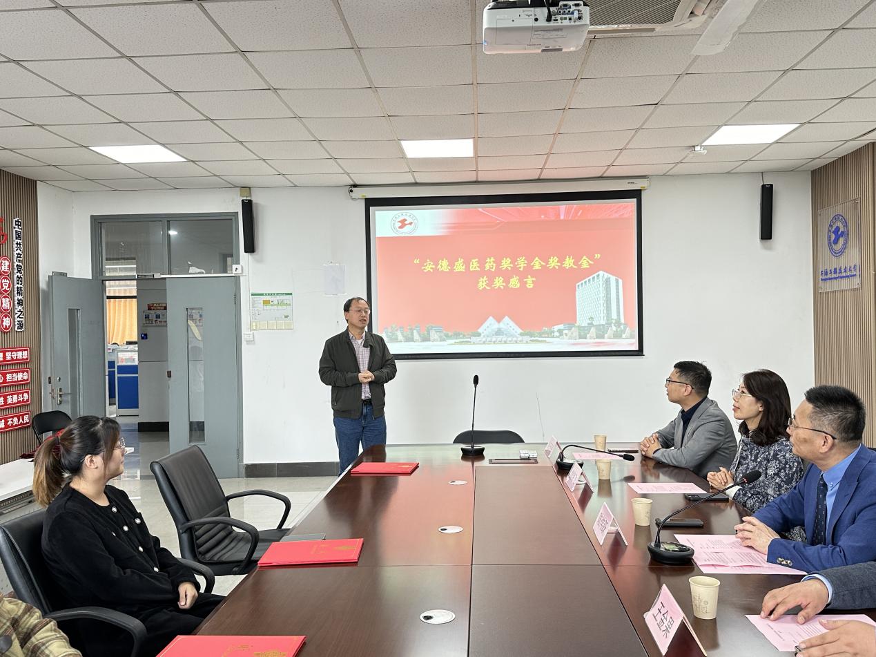 在颁奖环节中,医药前沿技术研究院院长陆伟跃教授宣读获奖研究生和教师名单。本次获得“优秀学习奖学金”的研究生是郭昌璞、龚静伊、黄雨萌,获得“优秀贡献奖学金”的研究生是彭仁苗和雷颖,获得“优秀教师奖教金”的教师为是尹学博和于桐。嘉宾们分别向他们颁发了第二届安德盛医药奖学金和奖教金证书。获奖研究生和教师们勇于挑战自我、奋进拼搏,在学习和工作上取得了傲人成绩,为研究院全体研究生和教职员工树立了榜样,本次获奖必将进一步激励他们再接再厉、再创佳绩。获奖教师代表尹学博教授表示,非常感谢安德盛医药对我们的支持,这不仅是一份荣誉,更是一份责任。我们将继续努力,争取在未来的科研工作中取得更大的成果,为国家的生物医药事业贡献力量。