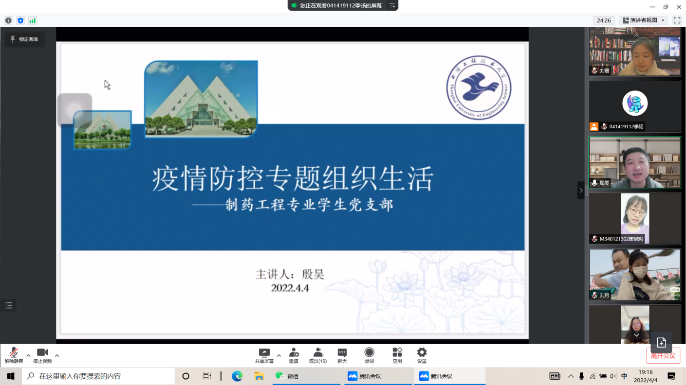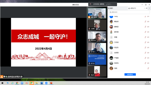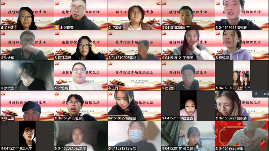 4月4日至5日,各党支部组织党员和部分群众开展了在线学习。会上,大家认真学习了孙春兰副总理对上海的疫情防控工作要求和李强书记关于疫情防控工作要求,详细讲解了学校疫情防控工作的十一项要求。会上还传达了学院疫情防控工作会议的精神,要求学院教师关注关心所指导研究生和本科生的生活学习情况和思想情绪,及时排忧解难;认真做好在线教学和学生指导工作,保质保量完成线上教学任务;鼓励大家特别是教师党员积极参加社区志愿活动,发挥党员先进模范作用。