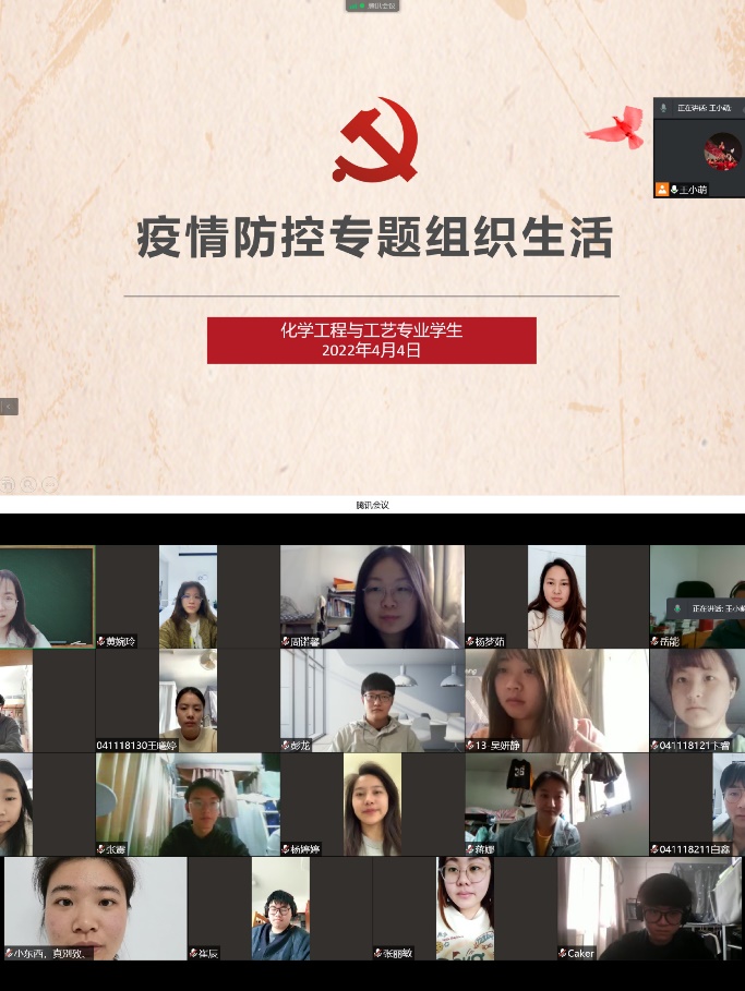 2022年4月4日,根据上级的有关要求,化学工程与工艺专业学生党支部线上开展了疫情防控专题组织生活。首先,党支部书记王小萌同志向党支部全体党员传达了上级有关工作要求,并进行了宣传部署。其次,全体党员认真学习了“近期疫情防控工作精神”的文件并在会上加以讨论,表明了自己的决心与态度。坚定信心,充分发挥党员示范带动作用;主动靠前,严格落实疫情防控工作。最后,王小萌同志指出,所有党支部成员,不管是在校党员还是校外党员,都要带头做到不信谣、不传谣,对不实言论要及时辟谣,力所能及地参加所在区域志愿活动,团结一心,共克时艰。