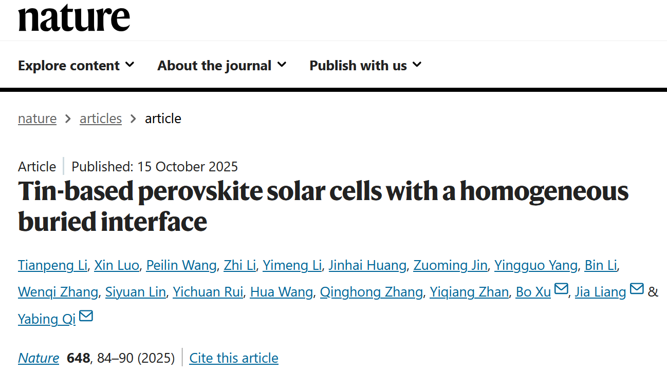 近日,国际顶级期刊《Nature》上刊登了题为“Tin-based perovskite solar cells with a homogeneous buried interface”的研究论文。该论文第一作者为化学化工学院21届硕士毕业生李天朋,我院芮一川老师等为共同作者。该成果将新型自组装单分子材料引入锡钙钛矿薄膜埋底界面,构建了能级匹配的均匀界面层,实现了空穴提取效率的显著提升;同时该分子薄膜形成的超润湿下层可诱导钙钛矿晶粒定向生长,使薄膜缺陷密度降低40%以上,最终制备的锡钙钛矿太阳能电池认证效率到达17.71%,刷新了世界纪录。