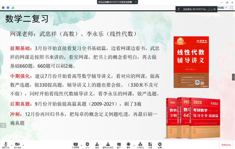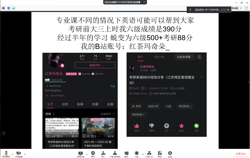 主持人曹鸣同学听完四位学长学姐的讲述后也分享了自己的心得体会,他认为准备考研的每一位同学都是可敬的战士,这是一场攻坚持久战。我们应该做到的,是认清自己的定位,选择好适合自己的学习方法,最终我们一定能成功上岸。