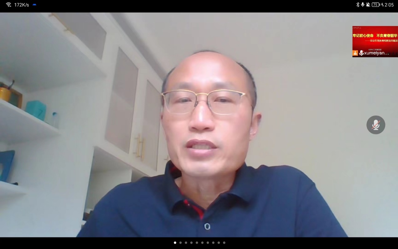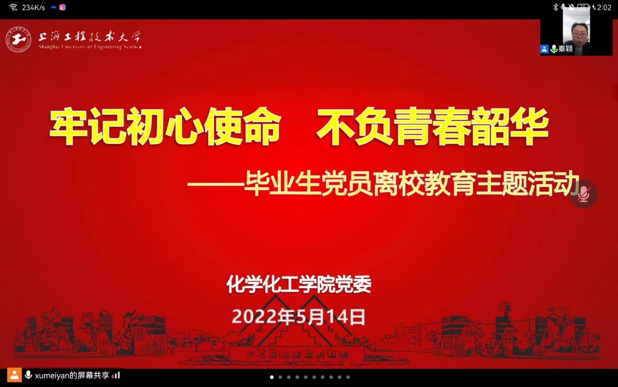 为进一步强化毕业生党员的身份意识,引导毕业生党员坚定理想信念,勇担时代重任,5月14日下午,化学化工学院党委在线开展“牢记初心使命,不负青春韶华”毕业生党员离校教育活动。学院党委书记宋勤健,学院关工委常务副主任卢柏龙,学院党委副书记秦颖,学院党委组织员、学生党支部书记和全体毕业生党员出席会议,会议由学院党委副书记秦颖主持。