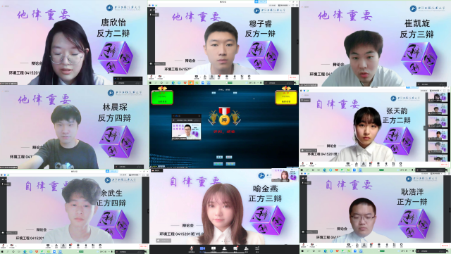 针对疫情下如何提升网课效果这一焦点,学院组织了以“自律重要,还是他律更重要”为主题的线上辩论会,参赛同学分成“自律重要”“他律重要”正反两队,双方辩手在立论陈词、攻辩、自由辩及总结陈词等各个环节中引经据典、据理力争,不仅思路清晰,而且逻辑严谨。