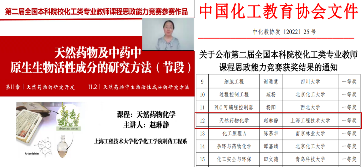 本次参赛课程《天然药物化学》为上海市重点课程,2017年入选我校首批“课程思政”建设专项,课程负责人赵琳静副教授曾荣获校“青年教学明星”、“优秀主讲教师”等荣誉称号。本次获奖充分展现了我校化工专业课程思政教学水平,是学校学院全面推进课程思政教育教学体系建设工作,深入挖掘课程思政元素,充分发挥课程思政育人功能,强化课程育人导向,推进课程思政高质量发展,切实把思想政治教育贯穿教育教学全过程,形成全员育人、全程育人、全方位育人格局过程中取得的可喜成果。