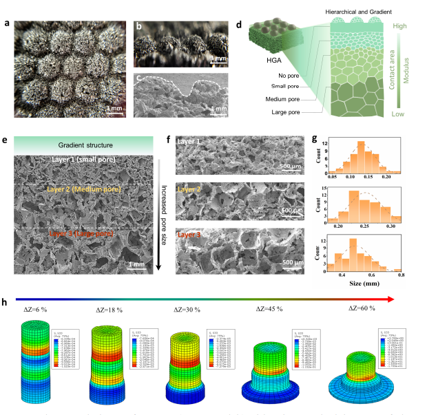 通常而言,压力传感器在压力作用下电阻、电流或电容的变化大小是直接影响其灵敏度的一个关键因素。然而,用于制造压力传感器的软材料或多孔聚合物是不可压缩或有限可压缩的,因此压力工作范围和灵敏度提高有限。在本研究中,作者在一个传感器中同时引入分层和梯度多孔结构,这种结构使传感器在宽压力范围内(0~400 kPa)产生压缩形变;另外,在其表面引入半球微孔结构,使得传感器在低应力下具有高的灵敏度且有助于其在较宽压力范围下灵敏度的提高。