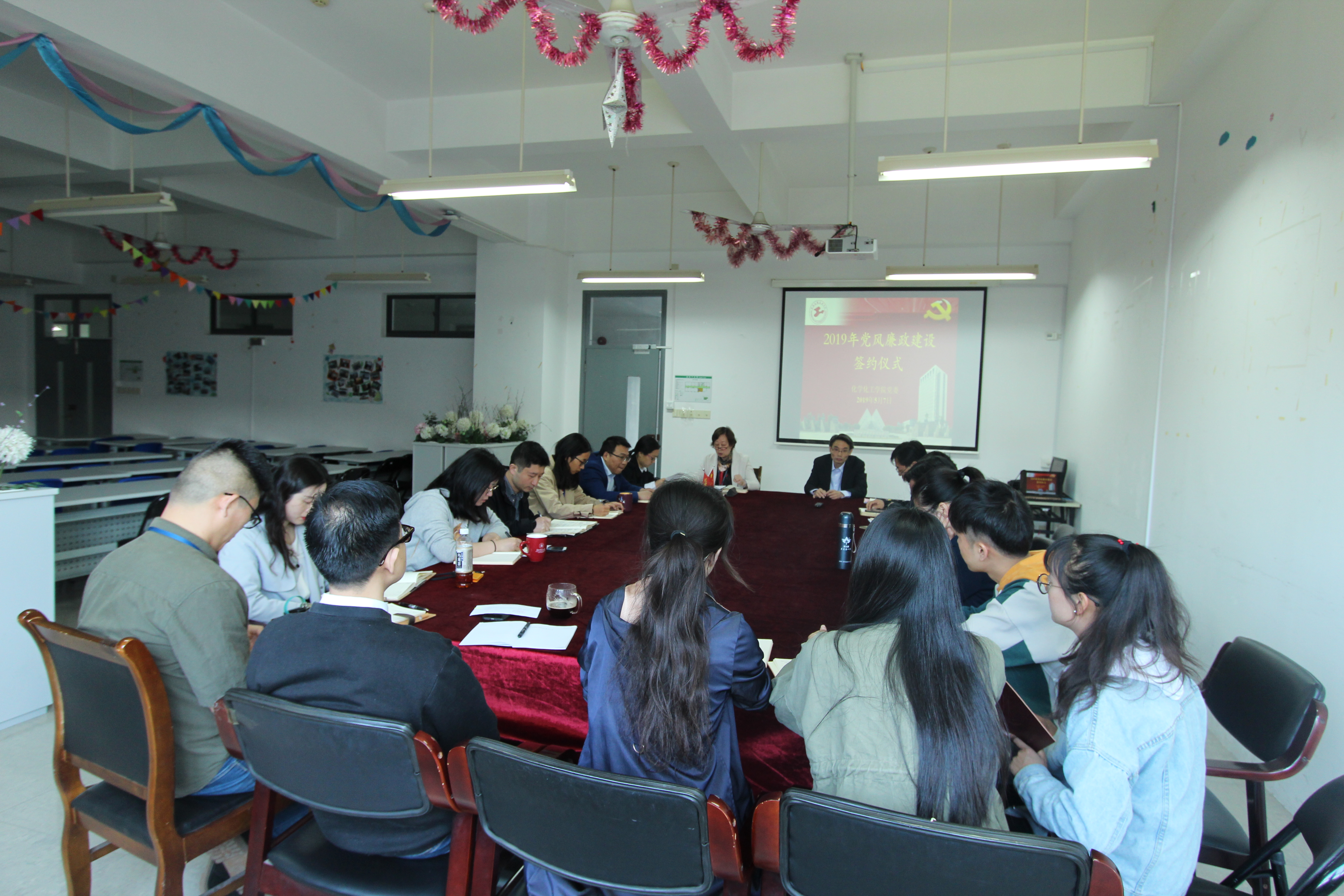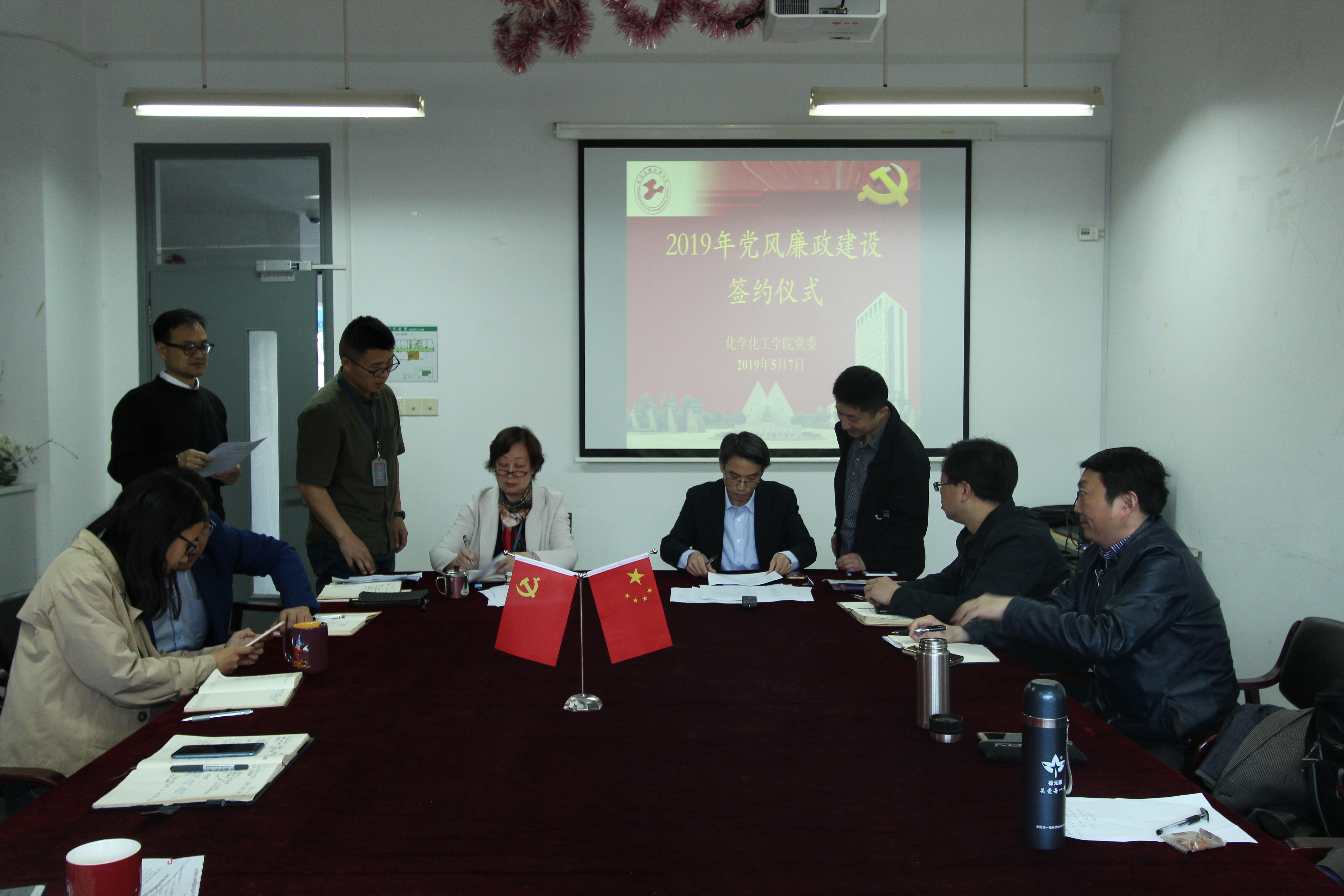 为深入学习十九大精神,以习近平新时代中国特色社会主义思想为指导,深入贯彻习近平总书记在十九届中央纪委三次全会上的重要讲话精神,认真落实学校全面从严治党工作会议工作部署,化学化工学院党委于5月7日上午在实训楼4403会议室举行2019年党风廉政建设签约仪式,会议由学院党委书记刘宇虹主持,学院领导班子成员、全体党支部书记和系(室)主任参加了本次会议。