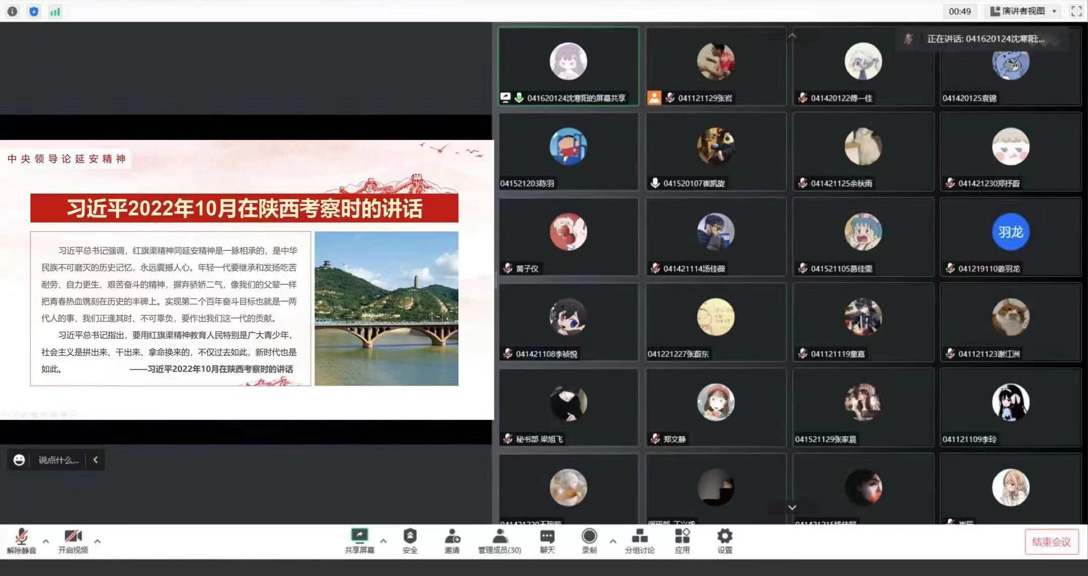 学生团干部通过“延安精神解读”、“延安精神的现实启示”、“中央领导论延安精神”三个方面全面学习了延安精神。学习结束后,大家也积极发言讨论。崔凯旋同学表示,通过此次线上参观,我们看到了老一辈革命家的延安生活,也深刻的体会到了延安精神的重要性和传承性。今后我们也要将延安精神落实到日常生活中。