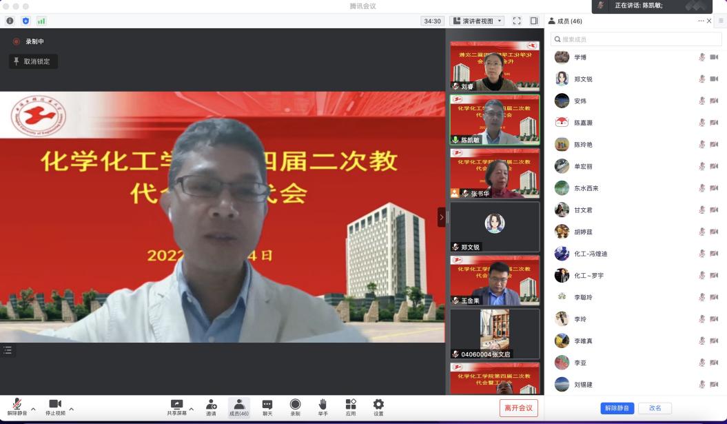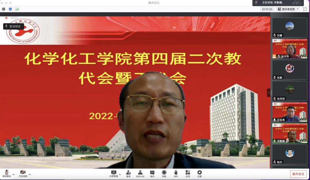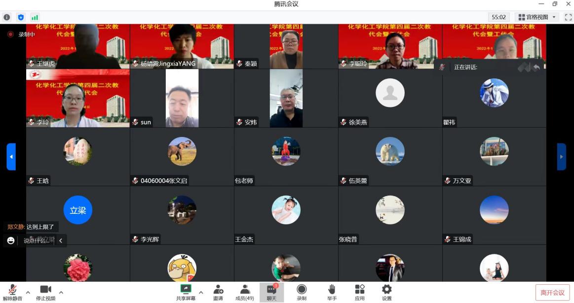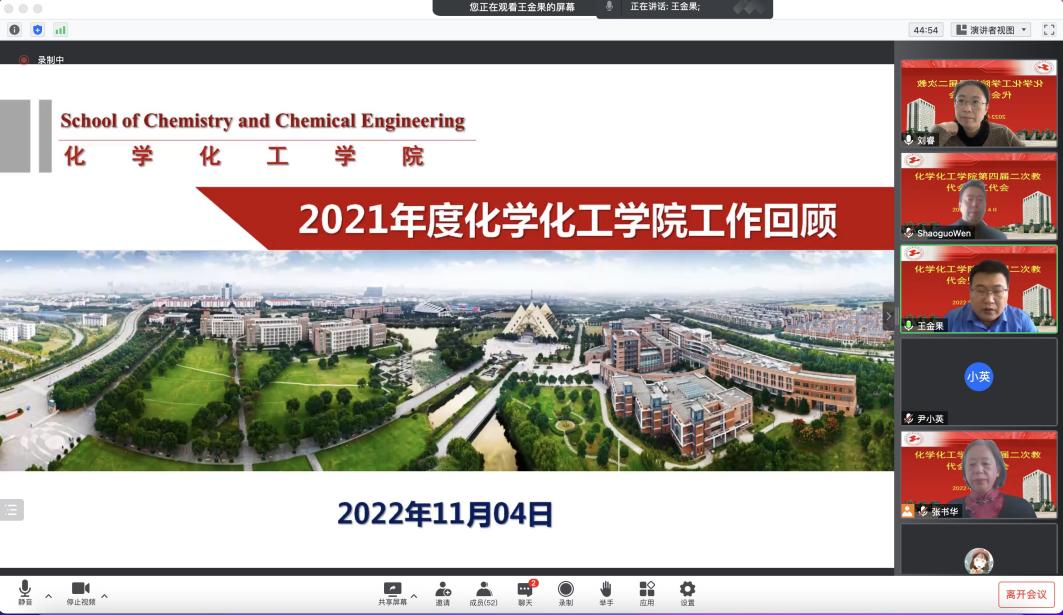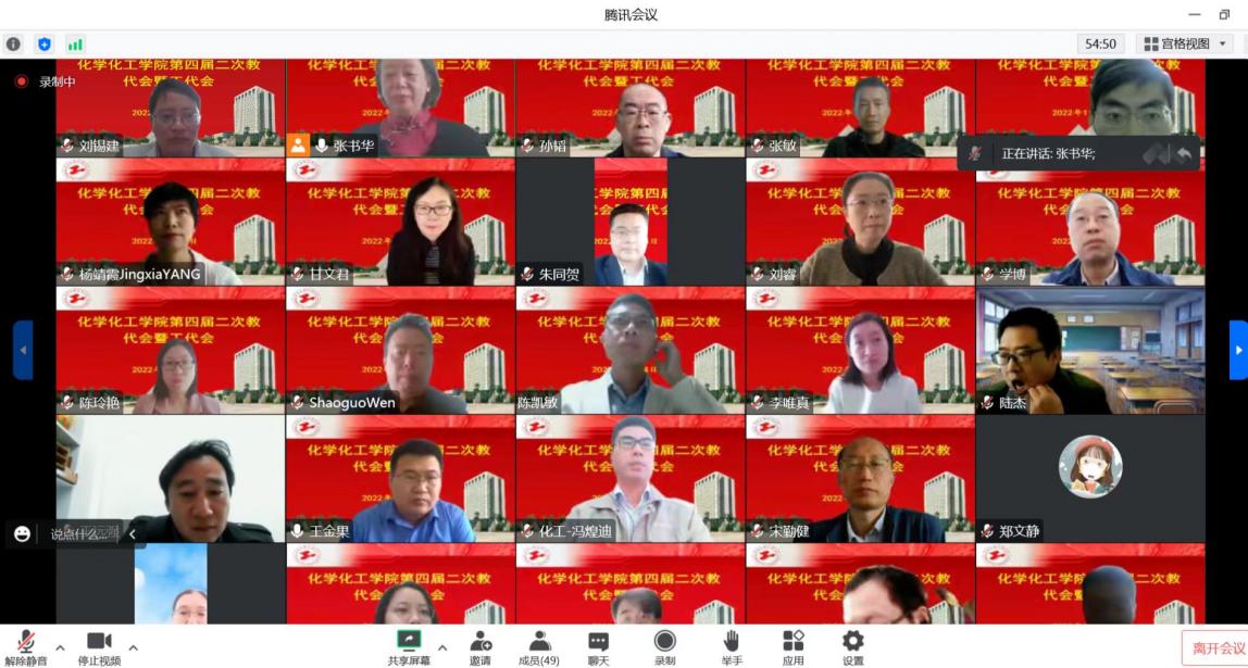 在举国上下深入学习和领会二十大精神,贯彻和执行党在新的历史时期总任务、总方针,新征程即将启程之际,化学化工学院第四届二次教代会暨工代会于2022年11月4日隆重举行。校工会张鹏副主席指导了此次会议筹备工作并参加了开幕式。因疫情原因,本次教代会在线上举行,在全体与会代表的共同努力下,圆满完成了预定的各项任务。