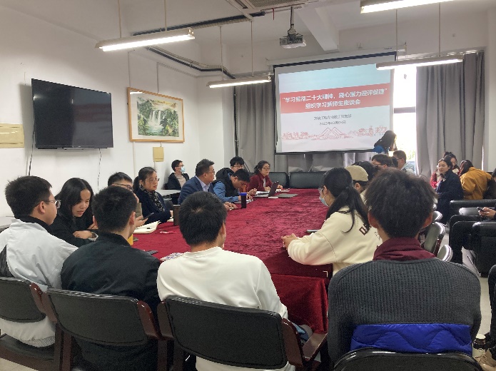 为深入学习贯彻党的二十大精神,加强师生间的沟通交流,3月3日中午,化学化工学院环境工程专业开展了“学习贯彻二十大精神,凝心聚力迎评促建”组织学习暨师生座谈会。学院党委副书记、院长王金果,副院长王润锴,环境工程专业教工党支部书记胡婷莛和环境工程系全体党员教师以及部分非党员教师代表出席了座谈会。