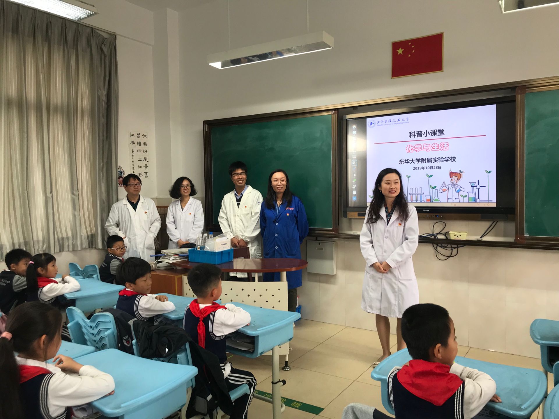 深入贯彻落实“不忘初心、牢记使命”主题教育为人民群众办实事、办好事要求,1028日下午,化学化工学院党委制药工程专业教工党支部进入东华附属实验学校课堂,开展主题为“化学与生活”的科普志愿服务活动。通过故事讲述导入化学基本概念,通过案例分析神奇现象的化学原理,通过生活中化学品(筛选安全无害,优选食品级)进行实验演示,有效激发了少先队员们对化学的兴趣,培养其科学素养。